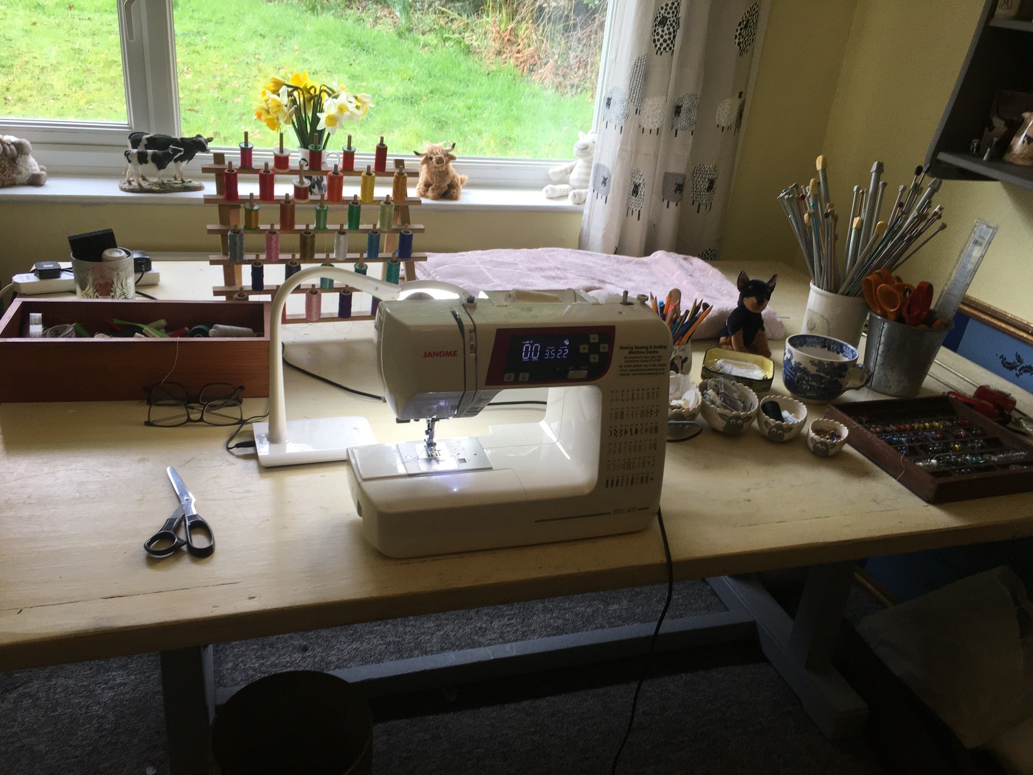 A) I use a method called raw edge applique and free motion embroidery. Where I can I use recycled materials and try not to waste anything. the smaller items I make are made from the left over fabrics from my cushions and chairs. I am currently working in my craft room but will soon be having a garden room built just for my work (mainly so that it doesn’t take over the whole house!)